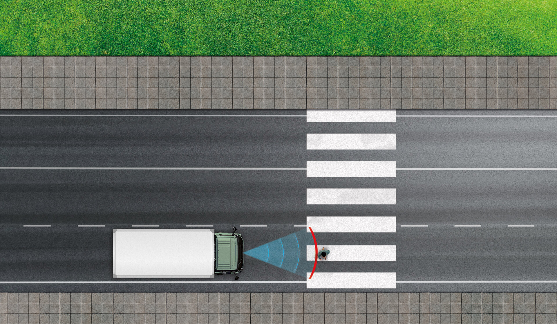 Das System erkennt Fußgänger und Radfahrer im vorderen toten Winkel des Fahrzeugs und warnt den Fahrer vor einer möglichen Kollision.
